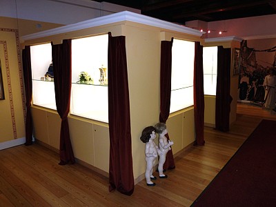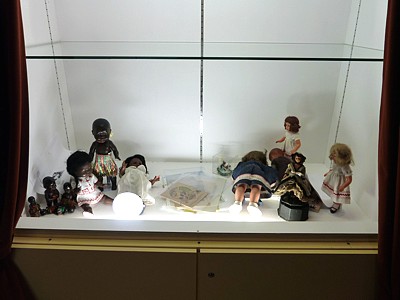 Danach gingen wir in den Ausstellungsraum mit den leeren Vitrinen und besprachen die Aufteilung. „Die Chefin“ gesellte sich zu uns und siehe da, drei Frauen hatten drei Meinungen. Doch schnell wurde eine Lösung gefunden und ich freute mich, dass ich die Vitrine, die nach meinem Empfinden den absolut besten Platz hat, sozusagen der Eyecatcher der Ausstellung, für meine Bärbel-Puppen bekommen hatte. |