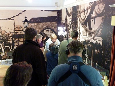 Das erste Interview hatte ich ja bereits bei der Vernissage gegeben und musste dabei feststellen, es ist ein großer Unterschied, auf welcher Seite des Mikrofons man steht. Ich arbeite seit über 20 Jahren für Printmedien. Da konnte ich mir die Fragen vorher notieren, die ich stellen wollte - hier musste ich immer wieder neu auf die Fragen eingehen und, ganz ehrlich, man hat nicht immer sofort auf jede Frage eine Antwort parat. Dann kam plötzlich Bescheid aus Itzehoe, am 1. Dezember wollte das NDR Fernsehen aus Kiel kommen. Meine Puppen würden zu Fernsehstars und ich mit ihnen - naja, vielleicht würde ich nicht gerade ein Star werden, aber ich wollte mich ordentlich anstrengen, damit meine Schätze ins rechte Licht gesetzt würden und viele Menschen sich durch die Sendung animiert fühlten zur Ausstellung zu kommen. |